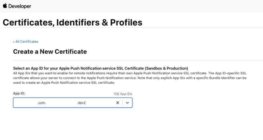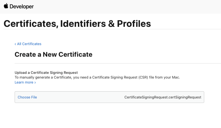 - Select your App ID, upload the CSR, continue, and download the generated