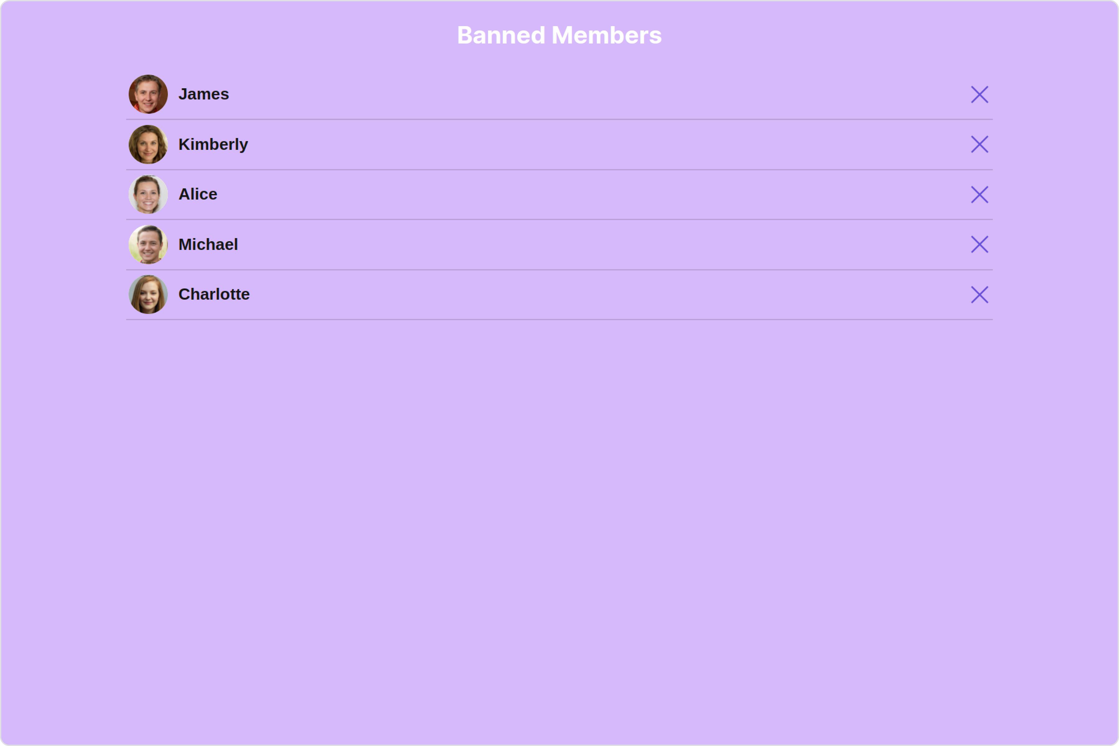 With this property, you can assign a custom ListItem to the Banned Members Component. Example Default: